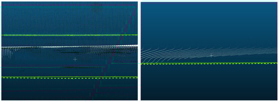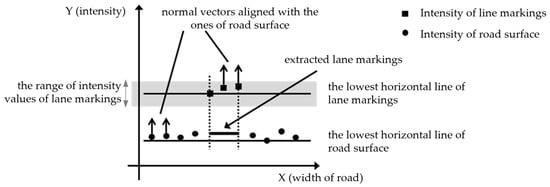 A range of intensity values must be established to distinguish between linear road markings. However, the intensity values are distributed depending on the measurement environment, such as weather, sunlight, and shadows. This means the intensity distribution can differ for each measurement even if the same area is resurveyed. Therefore, the intensity corresponding to linear road markings should be checked and set to include its value. After setting the range of intensity values that classified the linear road markings and road surfaces, the points of the extracted linear road markings were combined to determine the fitted plane (Figure 9).
