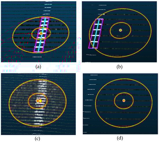 (a) The search area (the orange circles in (a,b)) detects linear road markings using intensity values. The center line (the sky-blue line in (a,b)) of the extracted area is a reference line of OBB, and the width is 20 cm, which determines an OBB (the pink rectangle in (a,b)). (b) The search area can detect the linear road markings by including the width of it. (c) The linear road markings whose intensity values are out of the range fail to be identified. (d) The search area cannot find linear road markings due to the exclusion of the markings area.