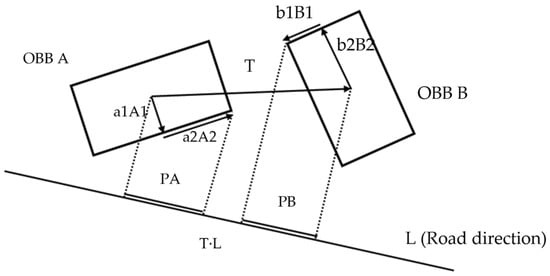 If an OBB rectangle is created, the OBB collision-detection algorithm connects the centerline of the conflicting OBB to build linear data based on the object. The separation axis of the figure used for applying the OBB collision-detection algorithm should apply a normal vector from the reference axis. In this study, the direction of the road was defined as the reference axis for extracting the road boundaries and lanes. If the road direction was set to that of the separation axis, the following process calculated the collision. The normal vector of the reference axis was used to check for collisions (Zhang et al. (2019) []), as shown in Figure 11: if the distance between the center point of and that of is defined as , is a vector with directionality. The value projected from the vector with directionality becomes (Figure 11). In addition, if the sum of the length of projecting the longest point from the center point of to the direction of and the length of projecting the long point from the center point of to the direction of A is greater than , a collision has occurred (Figure 11).
