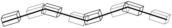 To automatically extract the linear data, the reference data to which the first acquired OBB is applied are used to check whether a line connects forward and backward. The search method obtains the range’s start- and endpoint groups by applying a search interval. Because the road may not be horizontal, an OBB was generated by applying a height equal to the search width. Subsequently, the OBB was generated at a position corresponding to the forward and backward intervals. The OBB is connected to the corresponding OBB and reference data to connect the lines (Figure 12).