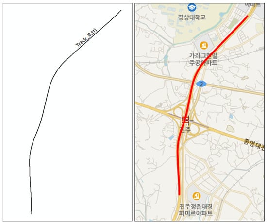 The experimental subject for automatic road linear data extraction was selected as a point group file, 3223.50 m (3.22 km) of the Namhae Expressway in Korea, passing through Jinju JC (Figure 15). This experiment aims to automatically extract all road boundaries and lane markings on road pavements.