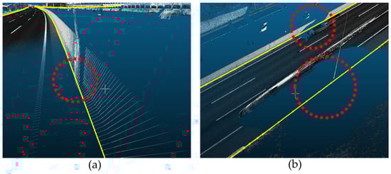 At some points, the error was larger than the other methods. The main reason for the high error values is that the points were areas where a lane was separated into two, which changed the number of lanes (Figure 31a). In addition, the occlusion caused errors because missing data in the occluded area generated randomly estimated points (Figure 31b).