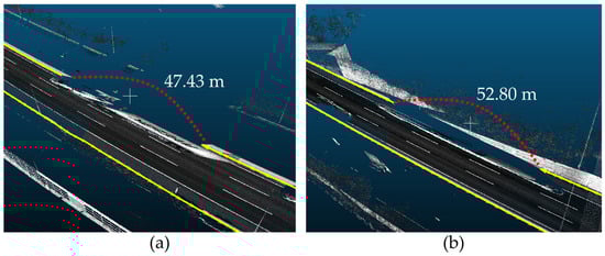 For the left-side road boundaries, the search length and width were set to 4 m and 1 cm, respectively (expanded by 1 cm on each side of the width of the generated OBB). This is because, as shown in Figure 15, the case area is slightly curved to the right. Therefore, to increase the automatically extracted area, the search length for the left-side road boundaries should be shorter than that for the right-side road boundaries. Moreover, owing to superelevation, a transverse slope along the road, increasing the outer edge of the road concerning the inner edge to decrease the chances of vehicles overturning, many rainwater basins were distributed on the left. This creates more noise on the left and right road boundaries; therefore, we applied a narrow search width. The search process was repeated five times, and the extraction was finalized four times. The total length of the extracted left road boundary is 3124.13 m, but the method failed to extract 52.80 m due to occlusion (Table 2).