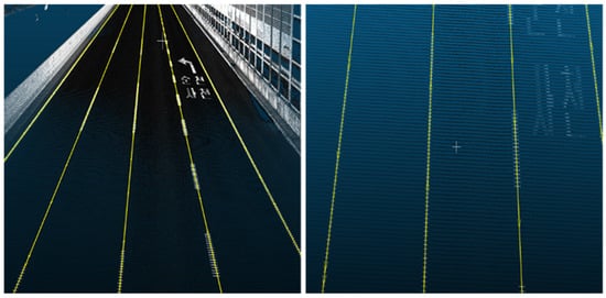 The results of the automatic extraction of markings are shown in Figure 22. Overall, the edge and lane markings were extracted within the marking areas because the case site had distinctive markings.