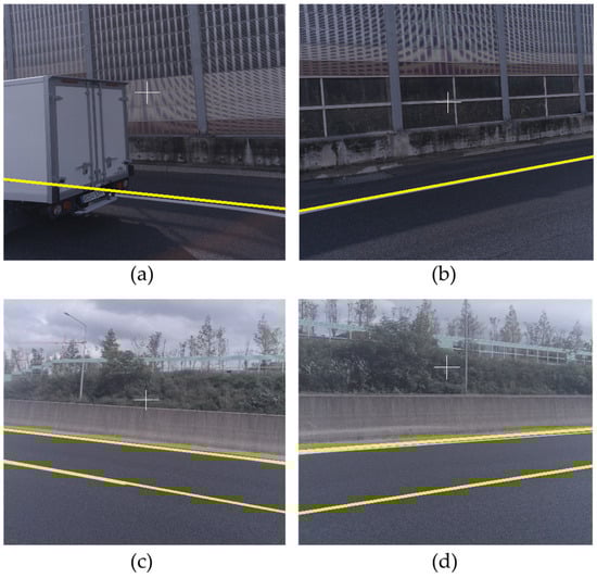 In our experiments, there were several occluded areas owing to surrounding vehicles (Figure 16a), and some factors hindered the generation of the reference line, such as bushes (Figure 16b) and rainwater basins (Figure 16c).