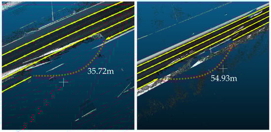 The overall results of the automatic extraction of the edge and lane markings are listed in Table 6. One criterion for determining the success or failure of extraction is whether the extracted line is generated within the marking areas. For edge markings, the length of the extraction error was 24.30 m at 4325.92 m, excluding the automatic extraction failure point, which is a 99.44% accuracy rate. For dotted lines, the length of the extraction error was 198.88 m at 9512.98 m, excluding the automatic extraction failure points of occluded areas, resulting in a 97.91% success rate (Table 6).