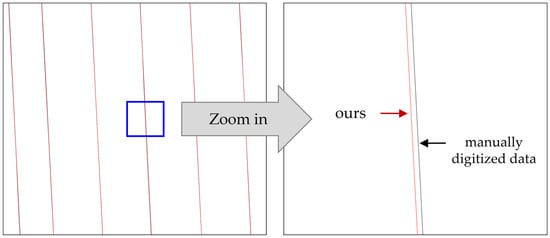 This section discusses the assessment of the horizontal position accuracy of the automatically extracted linear data by comparing them with manually digitized data for verifying the results of the proposed method. We evaluated horizontal positional accuracy because the manually digitized data were constructed at a lower level than ours. The comparative data were manually digitized road data provided by the National Geographic Institute and considered ground truth data. The error values were calculated by overlapping the two layers and computing the separation distance between the lines using the QGIS (Figure 26).