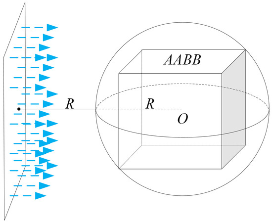 Next, based on the wavelength, we design a densely packed set of rays to simulate the propagation process of incident waves in the target’s geometric structure. When constructing the AABB, the maximum radius and geometric center of the target can be obtained. In order to reserve enough space, we will place the center of the constructed ray tube plane at the maximum diameter of the target along the direction of the incident wave with respect to the geometric center, as shown in Figure 6.