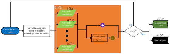 Most simulation algorithms typically utilize linear superposition for parallel acceleration, facilitating GPU acceleration. Through the use of GPUs, we can parallelly process the extensive ray tracing computations in SBR, as well as the numerous scattering centers in background simulation, thereby enhancing simulation efficiency. Our choice is to employ AMP programming, which offers the advantage of leveraging all GPUs supporting the DX11 architecture to accelerate the program. In the context of background simulation, since the background is a linear superposition of all scattering centers, different threads can be utilized to compute each scattering center and their echoes can be accumulated together through atomic addition. The detailed flowchart is illustrated in Figure 7.