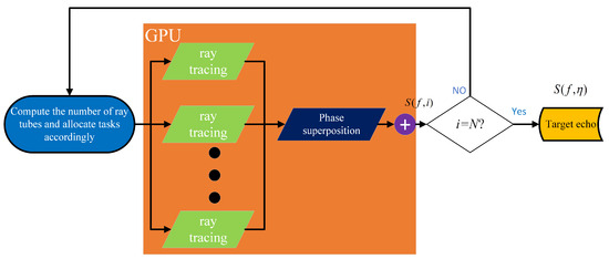 The goal of simulation is to calculate the sum of the backscattering coefficients obtained from all rays. GPU acceleration can also be utilized, and different threads can be used for tracing all the rays. Finally, atomic addition calculation is performed based on the scattering coefficients of each ray at different frequency points, resulting in the scattering coefficients of all frequency points under a specific azimuth angle. Ultimately, repetitive calculations are conducted for all azimuth angles to obtain the desired target echo. However, when there are too many rays, the use of atomic addition can lead to performance degradation. To improve the addition performance, multiple memories can be employed to represent the cumulative results of scattering coefficients for all rays. This approach helps avoid simultaneous accumulation by multiple threads on the same address, thereby enhancing performance. The flowchart of the target simulation program is illustrated in Figure 8.