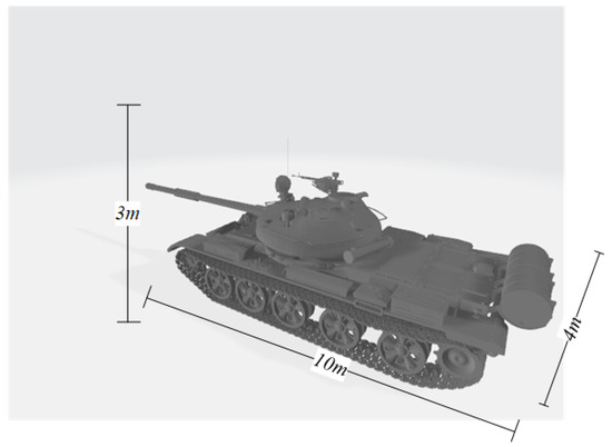 In order to validate the accuracy of this simulation method, we opted to compare our results with those presented in reference [23]. However, due to the unavailability of an exact ZSU-23 digital model in our laboratory, we selected the T62 tank as our simulated target and compared its simulation results with the measured data from the MSTAR dataset. The 3D model of the T62 tank is shown in Figure 11.