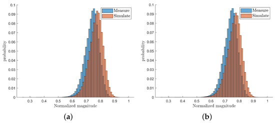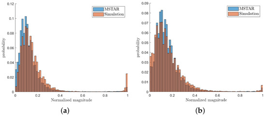 Comparison of amplitude distributions between simulated images and MSTAR data. (a) Comparison of amplitude distributions between simulated image and MSTAR data at . (b) Comparison of amplitude distributions between simulated image and MSTAR data at .