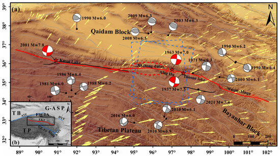 Seismotectonic background map of the East Kunlun Fault Zone (EKFZ). Faults are modified from [22] and are superimposed on the Digital Elevation Models (DEMs) from the Shuttle Radar Topography Mission (STRM). (a) The red dashed circle is the middle and long danger zone from 201–2030. The bold red line represents the EKFZ. The red five-pointed stars represent the historical earthquakes of the EKFZ. The dashed blue box indicates the InSAR data coverage. The black lines represent the rough surface rupture of the historical earthquakes [23,24]. The black dots are the historical earthquakes surrounding the EKFZ. The gray lines represent secondary faults around the study area. The yellow arrows represent GPS velocity fields at the regional. (b) Macroscopic distribution of the study area. T B is the Tarim Basin. G-A S P is the Gobi-Ala Shan Platform. T P is the Tibetan Plateau. The blue lines show the main faults around the EKFZ. Altyn Tagh Fault (ATF), Haiyuan Fault (HYF), Ganzi–Yushu Fault (GZ-YS), Xianshuihe Fault (XSHF), Longmenshan Fault (LMS).