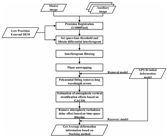 In this paper, InSAR data are processed using the GAMMA commercial software platform [50]. The interseismic deformation field was mainly obtained from the Sentinel-1 SAR satellite data by using the Stacking method. The method was proposed by Wright et al. [51] in 2001. It is a sequential InSAR algorithm that utilizes linear stacking of multiple unwrapped differential interferometry phase graphs to minimize atmospheric errors and improve the accuracy of the deformation rate [51,52,53]. The principle of the Stacking method assumes that in an independent interferogram, the error phase of atmospheric disturbance is random, and the deformation rate is linear. Then, the average deformation rate in the superposition time range of the study area can be obtained by calculating the average superposition of the phases unwinding corresponding to multiple independent interferograms [51,52,53,54,55,56]. The specific data processing flow is shown in Figure 2.