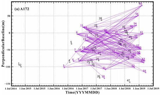 Distribution of temporal and perpendicular baselines of the interferogram. The images included in the inversion calculations are represented by the purple + labels. The images not included in the inversion calculations are represented by the black + labels. The interferograms are represented by purple lines. (a) The ascending orbit 172; (b) The descending orbit 004.