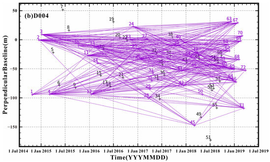 In this study, a total of 136 Sentinel-1 SAR images covering the XDS of the EKFZ were obtained from July 2014 to July 2019, with 64 ascending and 72 descending orbit images. The spatial range of these data was centered on XDS, 330 km in the NS directions and 280 km in the EW directions (Figure 1a; Table 1). We set the multi-look factor of the interferogram to 100:30, and the corresponding pixel size was about 420 m × 420 m, from which pixels with a coherence degree of about 0.2 were selected for phase unwrapping. Interferograms spanning a short time interval tend to have higher coherence. However, they make small tectonic signals, such as those across the XDS of the EKFZ, more difficult to detect. To minimize geometric decorrelation and errors due to the topography and maximize the deformation signal in the interferogram [25,51,52,53], we selected pairs of images by constraining the perpendicular and temporal baselines simultaneously. So, to improve the signal-to-noise ratio of interseismic deformation, we selected interferograms based on two criteria (Table 2; Figure 3). (1) Image pairs with temporal baselines of different Days were employed to maximize the deformation signal in the interferograms. (2) Due to the topography of the XDS of the EKFZ being very undulating, spatial baselines (separation between orbits) of less than 10 m, 100 m, and 200 m were used to minimize topography error influences, respectively. As can be seen from Table 2, the temporal and perpendicular baselines are coordinating relations and should be met simultaneously. (1) When the temporal baseline is less than 90 days, the perpendicular baselines must be less than 10 m; (2) When the temporal baselines are between 275 and 455 days, the perpendicular baselines must be less than 100 m; (3) When the temporal baselines between n + 275 and n + 455 days (n is an integer multiple of 365), the perpendicular baselines must be less than 200 m.