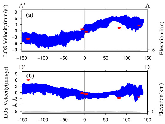 Accuracy evaluation showing the profile of GPS and InSAR deformation rates. The GPS measuring results are represented by red diamonds with error bars. The InSAR measuring results are represented by blue circles. The locations of the EKFZ are represented by the black vertical lines. The topographic information is represented by the gray areas. (a) AA’ profile in the ascending orbit and (b) DD’ profile in the descending orbit.