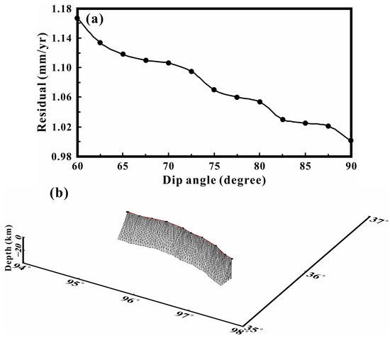 The geometric model parameters of the fault should be determined before the interseismic deformation model based on the InSAR-derived model. The following reasons should be considered before establishing the geometric models of the XDS of the EKFZ. (1) From Figure 4, we can see that the EKFZ mainly influences all the deformation information in the research area, so we do not need to consider the effects of other faults during the inversion process; (2) According to the previous studies, the dip of the XDS of EKFZ ranges from 70° to 90° [19,81]. We performed some search calculations to determine the fault dip angle. After varying the fault dip angle intervals and calculations several times, the results are shown in Figure 6a, and if the fault dip angle of the XDS of the EKFZ was set to 90°, the fitting residual was the smallest. Therefore, the fault dip angle of the XDS of the EKFZ was set to 90° when the fault model was established (Figure 6b); and (3) According to the inverse slip dislocation theory, the fault planes can be divided into upper and lower parts [71,82]. The upper part is responsible for the near-field deformation signal and is assumed to be the seismogenic fault. Its depth is determined to be 20 km by the source depth of the repositioned earthquake. The lower part is responsible for the far-field deformation signal and is assumed to be an elastic layer, and its depth is set to 80 km according to the depth of the lower boundary of the lithosphere [83]. In addition, we tested the slip rate distribution at depths of 20 km, 40 km, 60 km, and 80 km, respectively, and concluded that the slip rate distribution varied little when the section depth was about 40 km.