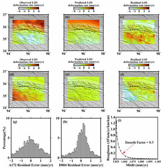The angular dislocation model can not only depict complex fault planes well but also avoid tearing caused by strike-slip direction deformation [64,68,84]. Therefore, the interseismic slip rate distribution in the XDS of the EKFZ was inverted with the InSAR average velocity field as a constraint (Figure 4). Figure 7 shows the interferogram fitting results, in which Figure 7a,d show the InSAR observation results of the ascending and descending orbits; Figure 7b,e show the interference results of the ascending and descending orbits; Figure 7c,f show the residual results of observation results and interference results; Figure 7g,h show the residual histograms of Figure 7c,f respectively; and Figure 7i shows the curve of model roughness and fitting residual L, with the optimal smoothing factor of 0.5. The overall fitting is reasonable, combined with the deformation characteristics of the region and the deformation characteristics of the near field of the fault. However, because some artifact signals in the local far-field signals were not entirely removed in the preprocessing stage and could not be fitted, they were deducted. Even if they were true deformation signals, they were too far from the XDS of the EKFZ to have anything to do with the movement of the XDS of the EKFZ.