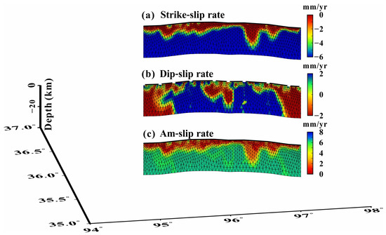 Figure 8 shows the distribution of the slip rates on the fault plane, and the fault is in motion in the depth range. In Figure 8a, the deformation information of XDS of the EKFZ is dominated by the strike-slip rate. The deep strike-slip rate of the fault is about 6 mm/yr, and the maximum locked depth is about 30 km. In Figure 8b, the distribution of the dip-slip rate is limited to 2 mm/yr in the fault deep. In Figure 8c, the distribution of the slip loss is about 6 mm/yr on the fault surface.