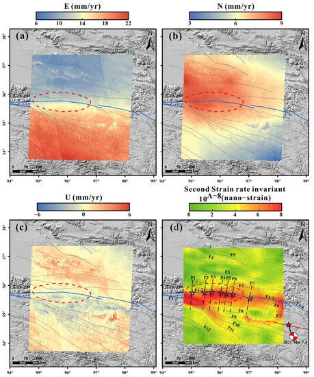 The strain rate field is one of the important constraints on tectonic deformation and allows for assessing seismic risks [19,42,88,89,90]. In this study area, we obtained the second strain rate invariant of the XDS of the EKFZ based on the three-dimensional deformation field (Figure 9d). As can be seen from Figure 9d, the accumulation of strain is mainly concentrated in the southeast direction of the Kusai Lake segment of EKFZ (F1-1), the XDS of the EKFZ (F1-2), and Tuosuo Lake segment (F1-3), with the accumulation amount of about 80 nano-strain, and other regions are diffused. It can be inferred that the EKFZ dominates the strain model in the Qinghai–Tibet area and that the 2001 Kunlun Mountains MS 8.1 earthquake has a loading effect on the strain accumulation of F1-1 and extends to the southeast direction.