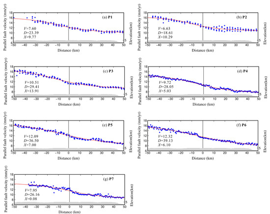 Section view of the XDS of the EKFZ along the parallel direction in Figure 9. The blue dots represent InSAR observations, the red line segments represent the best-fit values, the black vertical lines represent the location of the EKF (same as in Figure 5), and the gray areas represent topographic information (same as in Figure 5). The best fitting parameters are marked in the lower left corner of (a–g). V represents the modeled slip rate at depth (mm/year), D represents locking depth (km), and X represents the distance from fault location (km).
