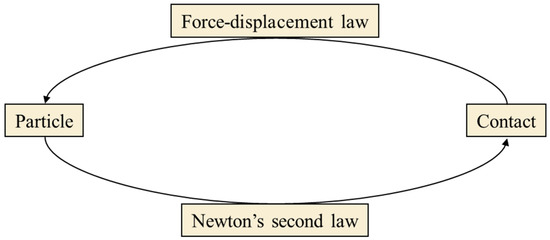 The original version of the distinct element method (DEM) was first proposed by Cundall (1971) [45] for the analysis of rock mechanic problems. It was later applied to granular material by Cundall and Strack (1979) [46]. The three-dimensional particle flow code (PFC 3D) developed by Itasca Consulting Group, Inc. is a simplified implementation of the DEM. It treats the sliding mass as an assembly of solid elements and describes the motion process from the perspective of particle interactions. Its dynamic behavior is represented numerically using a time-stepping algorithm, and the solution scheme is based on the explicit finite-difference method. The calculation cycles performed in the PFC alternate between the application of Newton’s second law to the particles and a force–displacement law at the contacts (Figure 1). From this, the velocity and displacement of each particle can be obtained in real time at a time step scale. Because PFC 3D performed well when simulating past events [13,20,21,37,47], it was used for forecasting the landslide blocking river process. Following this, the landside runout behavior and deposit morphology could be obtained.