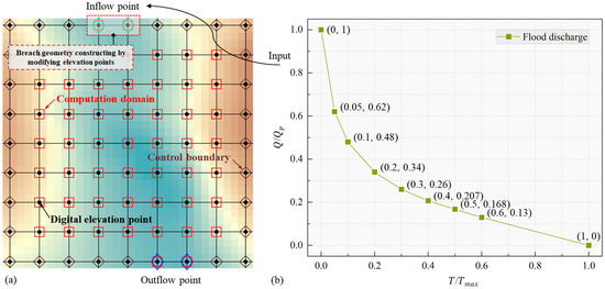 In a simulation, the computational domain is a user-defined complex terrain consisting of discrete elevation points with a fixed spacing (Figure 4a). Benefiting from this, the breach geometry (i.e., breach width and depth) can be constructed by modifying the present terrain. The inflow boundary conditions were set by a flood hydrograph at breach (e.g., a generalized flood hydrograph in Figure 4b), while the outflow and control boundaries were adapted to the actual terrain.
