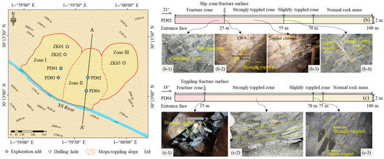 (a) Engineering geology map of the Mogu toppling slope. (b) Toppling zonation and onsite photos (b-1–b-4) of PD02. (c) Toppling zonation and onsite photos (c-1–c-3) of PD04.
