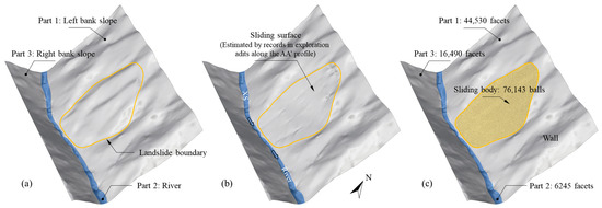 For the Mogu landslide, the potential instability area was identified; erosion was not considered due to the short runout distance. Therefore, the ball–wall model was adopted to construct a landslide numerical model. The modeling procedures were carried out using Rhino 6 software and can be described as follows. First, the present topography was constructed based on a 12.5 m digital elevation model (Figure 9a). It was divided into three independent parts (left bank, river, and right bank) to facilitate the assignment of different parameters. Second, the landslide boundary was determined by importing the boundary of the identified potential instability area in Section 3.1.3. Third, the depth of the sliding surface was extrapolated based on the records from exploration adits and drilling boreholes; the derived profile AA’ is shown in Figure 8. From this, the basal slip plane was approximated by projecting and interpolating the records along the profile AA’ (Figure 9b). The topography, including the sliding surface, was then represented by 67,265 triangle meshes used for DEM simulation (Figure 9c). Finally, the sliding mass area was generated by converting the enclosed space bounded by the present topography and the sliding surface into a geometric entity. Its volume was 9.1 × 106 m3 (volume is obtained using the Rhino 6 software), and it was filled by 76,143 balls with radii between 2.0 and 3.32 m (Figure 9c).