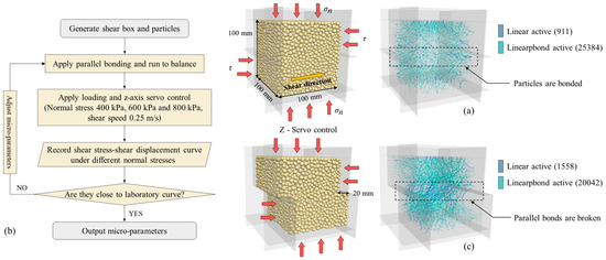 (a) A bonded particle model used for the numerical direct shear test. (b) Flow chart of micro-parameter calibration, modified after Tai et al. (2023) [60]. (c) Contact distribution of a numerical sample after 20 mm shear displacement under a constant normal stress of 800 kPa.