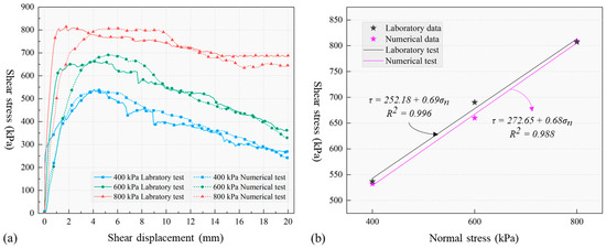 A comparison between the results of the laboratory experiments and the numerical direct shear test. (a) Shear stress versus shear displacement. (b) Shear stress () versus normal stress ().