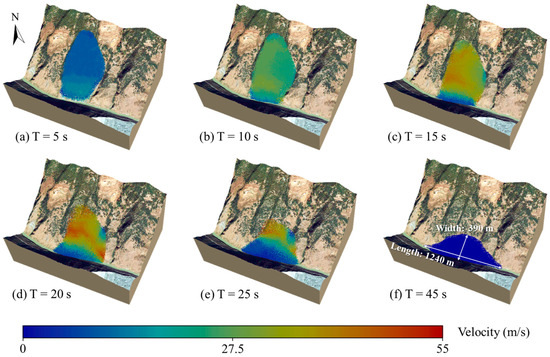 In the initial stage, the lower particles lost stability first (Figure 14a). Next, the middle and upper particles were initiated in sequence due to the absence of bottom support (Figure 14b). Then, the sliding mass maintained an extremely high speed for 10 s in the second stage (Figure 14c,d). Its average velocity reached its maximum (29.4 m/s) at approximately 15 s (Figure 13a). In this stage, the front particles reached the river valley and their velocity began to decrease due to an increase in the wall friction coefficient and flat terrain. In the third stage, the front particles across the river valley hit the opposite bank. They were deposited at the bottom of the valley, while the rear particles continued to move, but were obstructed by the stopped particles in the front (Figure 14e). Therefore, the average velocity began to gradually decrease during this stage. Nearly all of the particles stopped moving after 45 s (Figure 14f). The elevation of the sliding mass dropped by 213 m, and the released energy was 3 × 1013 J. The final horizontal runout distance was only 462.5 m, because the sliding process was severely restrained by the deep and narrow valley. Generally, the Mogu landslide is a high-speed, short-runout rock avalanche, according to the classification scheme updated by Hungr et al. (2014) [65].