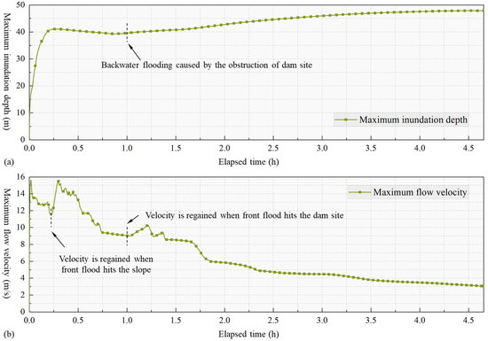 The maximum inundation depth and flow velocity in the flood propagation were monitored, and the results are shown in Figure 18. Regarding the maximum inundation depth, it increased rapidly in the first 0.25 h, and then experienced a short deceleration process as the flood flowed forward. After the front flood hit the dam site (Figure 17c), it gradually increased due to the obstruction of the dam site (Figure 18a). Regarding the maximum flow velocity, it reached its peak (15.6 m/s) within one minute. Then, it decreased rapidly because the energy dissipated due to basal flow friction. Subsequently, the flow velocity was regained, in part, after two strong impacts between the water and the slope/dam site (Figure 18b). Especially for the first impact, the flow direction changed significantly (Figure 18a,b), and the flow velocity returned to 15.4 m/s. Finally, the velocity gradually decreased along with the time elapsed in the stage of backwater flooding.