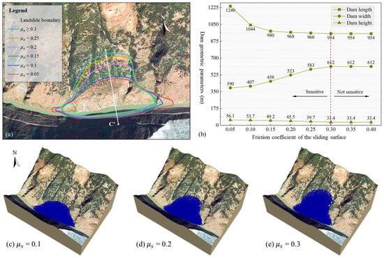 Sensitivity analysis results of the friction coefficient of the slip surface (). (a) Aerial view of the boundary of the simulated landslide dam, with varying between 0.1 and 0.4. (b) Landslide dam geometric parameters versus . Note: the dam depth was measured from the profile CC′; and the red dashed line indicates that the threshold value of sensitivity analysis of is 0.3. (c–e) 3D view of the simulated landslide dam with of 0.1, 0.2, and 0.3.