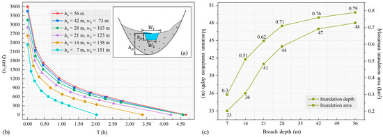 In Section 3.3, the worst scenario (complete dam-break) was adopted for flood hazard predictions. However, a landslide dam may not be completed destroyed in an actual event, since the dam length along the longitudinal river profile becomes longer as the dam elevation decreases. To investigate the influence of breach depth () on flood hazard mapping, different scenarios were established by modifying it. Assuming that the breach morphology was an inverted isosceles trapezoid (Figure 20a) [24,29,30,31,32], the breaching parameters of each scenario are listed in Table 4. Then, the flood hydrographs of the inflow points were recalculated according to Table 3 and Equation (6) (Figure 20b), and the breach morphology of each scenario was modified in the digital elevation model.