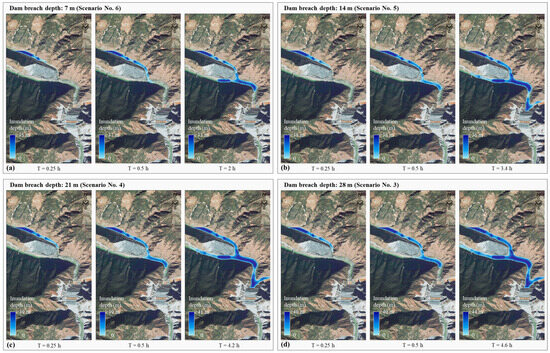 The simulated results of scenarios No. 3~No. 6 are presented in Figure 21. After the front flood hit the dam site, the front water level of the dam site did not keep rising in scenario No. 5 or No. 6 (Figure 21a,b) due to a limited volume of water released, which was different from the worst scenario (Figure 17). In contrast, the trends of flood propagation in scenarios No. 3 and No. 4 were consistent with the worst scenario, except for the predicted inundation depth and area (Figure 21c,d).