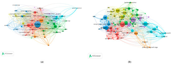Figure 2 shows the co-occurrence of topical concepts derived from titles and abstracts from (a) studies based on satellite-borne data and (b) drone-acquired data. Figure 2a illustrates seven topical clusters in dark blue, light blue, red, green, purple, yellow, and orange for mapping crop spatial extent and health status. The key terms from the “red” cluster were “agriculture”, “spad value”, “low cost”, “remote sensing data”, “hyperspectral data”, “multispectral data”, “VIS”, “processing”, “size”, and “crop field”, which directly imply the utility of “low-cost remote sensing” systems for mapping and monitoring NUS crop productivity (spad-value/chlorophyll) with remotely sensed data in smallholder crop fields (Figure 2a). The second-largest cluster linked to UAVs was in yellow and contained “growth”, “variety”, “trait”, “detection”, “plant-height”, “UAVs”, “drone”, “dsm”, “rgb”, and “msi”. This cluster articulates the use of drone remotely sensed (“UAVs”) data in detecting and mapping relevant NUS phenotypical attributes (“growth”, “variety”, “trait”, “detection”, and “plant height”). The third cluster in dark blue included ‘growth stage’, “lai”, “crop height”, “agdw”, “canopy nitrogen”, “weight”, “fusion”, “plsr”, and “rmse” as the key terms in order of importance (Figure 2). This cluster relates to the estimation of NUS crop productivity attributes (“lai”, “crop height”, “agdw”, “canopy nitrogen”, “weight”, “lai”, “crop height”, “agdw”, “canopy nitrogen”, and “weight”) using remotely sensed data and regression techniques. The fourth cluster in green contained “population”, “climate change”, “water stress”, “food security”, “African leafy vegetable”, “suitable area”, “moisture”, “SSA” (Sub-Saharan Africa), and “validation”, among others. This links to the food and nutrition security issues in SSA, which are highly impacted by climate variability, such that NUS crops (“African leafy vegetable”) are the only suitable crops because of their drought tolerance. The fifth cluster, which is light blue, features co-occurring terms, such as “species”, “reflectance”, “density”, “waveband”, “nir”, “classification”, and “palmer amaranth”. This cluster relates to the impact of species variability and plant or foliage density, which causes the spectral signatures of NUS crops to vary at different wavebands of the EM spectrum, facilitating optimal classification accuracies. The sixth cluster is characterised by the co-occurrence of terms such as “plant”, “amaranth”, “phenological”, and “growth stage”, which relates to the assessment of NUS crops’ phenological characteristics.
