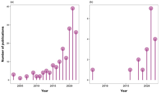 Frequency of published articles on remote sensing applications of NUS based on (a) all sensors and (b) drones.