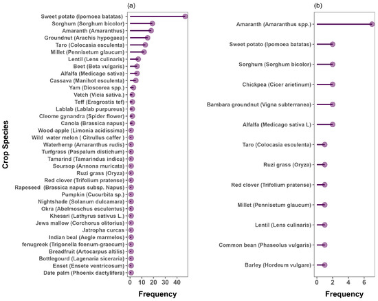 The most prevalent NUS in the retrieved literature included sweet potato (Ipomoea batatas), sorghum (Sorghum bicolor), amaranth (Amaranthus cruentus), cassava (Manihot esculenta), cowpea (Vigna unguiculata), millet (i.e., pearl (Pennisetum glaucum L.R. Br.), finger (Eleusine coracana), and proso millet (Panicum milliaceum)) (Figure 5a). UAV-based remotely sensed data was utilised in mapping the attributes of amaranth (n= 6) [17], Legume (Fabaceae) (n = 2) [18], Sweet potato (n = 2) [20], sorghum (n = 2) [21], and bambara groundnut (Vigna subterranea) (n = 2) [22] (Figure 5b). Most of the retrieved literature remotely sensed various NUS using hyperspectral data, hence the decline in the frequency of NUS studies that utilised drone and satellite-acquired remotely sensed data (Figure 5).