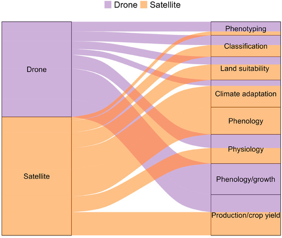 Eight key broad research themes emerged from the reviewed literature on NUS. These include phenotyping, crop genetics, crop productivity, crop physiology, phenology, crop adaptation, classification, and land suitability (Figure 6). Most reviewed studies focused on quantifying NUS’ physiological and phenological crop traits. A relatively small number of studies characterised crop classification and spatial extent. Five studies discriminated crops based on drone-acquired data, while six articles were based on satellite-borne remotely sensed data (Figure 6). The most extensively researched areas based on all satellite-borne sensors included phenology (n = 142), crop physiology (n = 110), and crop productivity (n = 104). When considering only the drone-borne sensors, 16 studies focused on NUS phenology. These studies mainly assessed external crop attributes, such as crop LAI, biomass, crop height, and crop yield periods across the growing season. For example, Jewan, Pagay [23] monitored six distinct phenological stages of the Bambara groundnut, estimating its yield. Only nine studies assessed NUS crop productivity, while seven research studies examined NUS crop health and physiology. For instance, Lati, Avneri [24] assessed the utility of a UAV imaging platform coupled with an RGB sensor to monitor chickpea’s physiological and morphological parameters, such as LAI, biomass, and yield, during irrigation periods.