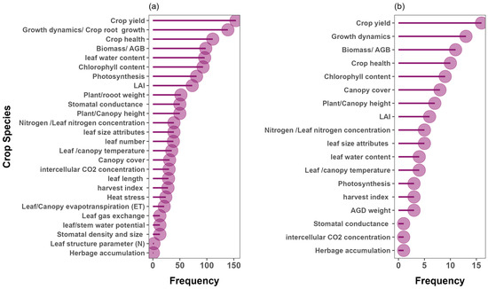 Frequency of studies that remotely sensed a specific crop attribute based on (a) all satellite and drone-borne sensors and (b) drone-borne sensors only.