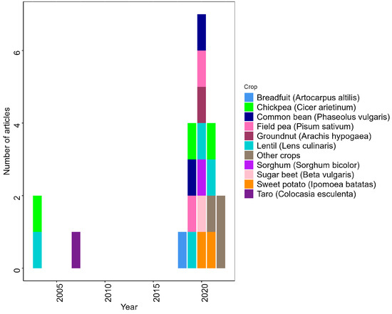 Based on the findings, 12 articles characterised the spatial distribution of various NUS (Figure 8). Sweet potato, lentil, and chickpea were the crops that received substantial attention in the literature (Figure 8). Overall, a limited number of studies have utilised UAV remotely sensed data to classify NUS. There is a gap in the research focusing on UAV classifications from 2008 to 2019. Furthermore, 2020 was the most predominant year for NUS classification studies. Nevertheless, research on the spatial distribution of NUS remains sparse and limited to developed regions. The increase in literature could point to an increase in the interest in NUS and the general application of UAV-acquired remotely sensed data.