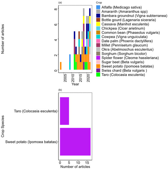 Fifty articles estimated the stomatal conductance of NUS based on satellite-borne remotely sensed data. Specifically, studies in the USA and China mapped these NUS mostly using sensors, such as Planet scope, analytical spectral devices, UAVs, MODIS, and Sentinel 2 MSI (Supplementary Figures S1 and S2). There was a modest amount of research on stomatal conductance between 2003 and 2011. However, the literature related to farm-scale stomatal conductance increased from 2013 to 2022 (Figure 9). In remote sensing, the stomatal conductance of NUS, sweet potato received more research attention (17 studies), followed by taro (5 studies), cowpea (5 studies), sorghum (4 studies), and amaranth (4 studies) (Figure 9). Meanwhile, very few studies have been conducted concerning the stomatal conductance of crops such as cassava and millet. These crops were less frequent in the retrieved literature (Figure 9a,b) than previously stated. However, there were few studies on remote sensing applications for estimating the stomatal conductance of taro based on UAV-acquired remotely sensed data from the retrieved literature. The specific countries and sensors used in mapping these NUS are detailed in Supplementary Table S6.