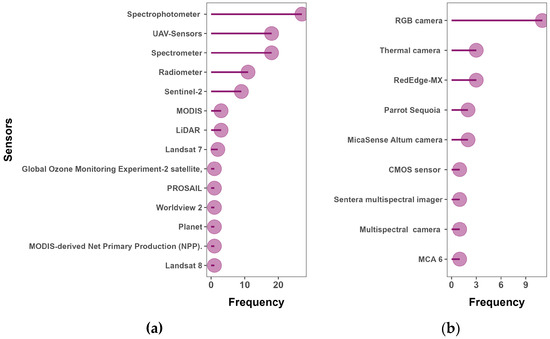The utilization of Earth-observation sensors in the remote sensing of NUS studies is significant. Thirteen different sensor types were noted in the reviewed literature (Figure 10). In terms of sensors, the findings of this review revealed that the spectrophotometer was the most widely used sensor for characterizing the health status of NUS, being used in 27 studies. Furthermore, research results indicate that various studies have used handheld hyperspectral devices to acquire in situ remotely sensed data to detect and map NUS biophysical and phenological attributes. The most predominant sensors in the retrieved literature were spectrophotometers (27), UAV-borne sensors (n = 18), spectrometers (n = 18), radiometers (n = 11), Sentinel- 2 MSI (n = 9), MODIS (n = 3), and LiDAR (n = 3) (Figure 10a). Meanwhile, the most frequently used drone-borne sensors were RGB cameras (in 11 studies) [26], RedEdge-MX (in three studies) [27], and Canon (in three studies) [23]. These were followed by thermal cameras [28], Parrot Sequoia, Micasense Altum [20], CMOS cameras [29], and MCA6 [17] in order of frequency in the retrieved literature (Figure 10b).