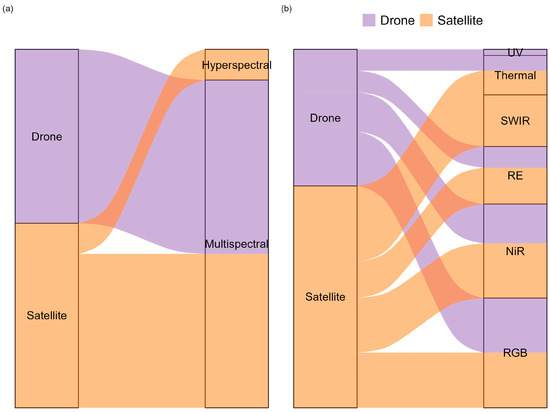 Visual distribution (frequency) of (a) Spectral characteristics of satellite and drone borne sensor, and (b) specific sections of the electromagnetic spectrum they covered in the literature (See Supplementary Table S2 for frequency values). UV is ultraviolet, SWIR is shortwave infrared, RE is red edge, NiR is near-infrared, and RGB is the red, green, and blue spectra. (See Supplementary Materials spreadsheet for frequency values.