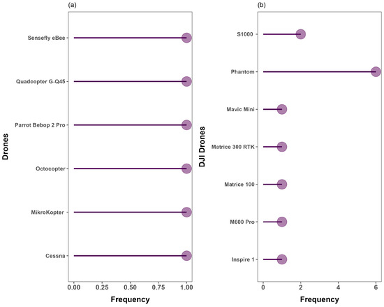 Frequency of (a) summarised drone platforms (b) and DJI drones utilised in the literature to map the spatial distribution of NUS and their health attributes.