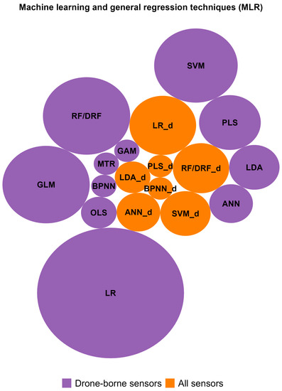 Frequency of machine learning and general regression techniques used in remote sensing NUS attributes based on all sensors and drone-borne sensors. (GLM is generalised linear model, RF/DRF is random forest, LR is linear regression, SVM is support vector machine, OLS is ordinary least squares regression, ANN is artificial neural network, BPNN is back propagation neural network, GAM is generative adversarial networks, LDA is linear discriminant analysis, and PLS is partial least squares regression. (See Supplementary Materials spreadsheet for frequency values).