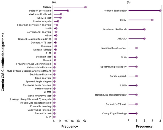 In terms of generic statistics and classification techniques, Pearson correlation, ANOVA, maximum likelihood (ML), OBIA, and the empirical line method (ELM) were the most frequently utilised algorithms based on satellite and drone-borne remotely sensed data (Figure 14). The Mahalanobis distance, parallelepiped, k-means, and canny edge filtering were some of the popular generic classification algorithms used to map NUS based on satellite and drone-acquired remotely sensed data. Studies that were based on generic classification were relatively few for each algorithm (<5) when compared with all other algorithms utilised in the retrieved literature (Figure 14a). Generic classification procedures, such as the analytical hierarchical process (AHP), cluster analysis, fuzzy logic, and multilayer perceptron, have not yet been utilised in conjunction with drone-acquired remotely sensed data for crop mapping (Figure 14b).