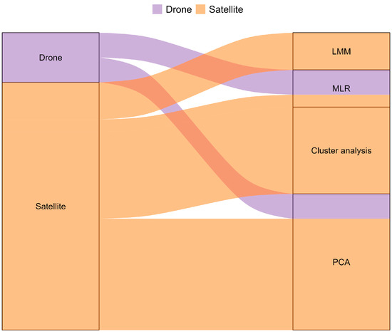 Regarding multivariate techniques, PCA followed by cluster analysis and multiple regression were the most frequently used algorithms based on satellite and drone-acquired data combined (Figure 15). Studies based on linear mixed model and machine learning algorithm classifications were relatively few (<5) compared with PCA and cluster analysis. There seemed to be scanty literature (<5) that utilised multivariate techniques in conjunction with drone-acquired data for mapping the spatial distribution of NUS and their health attributes.